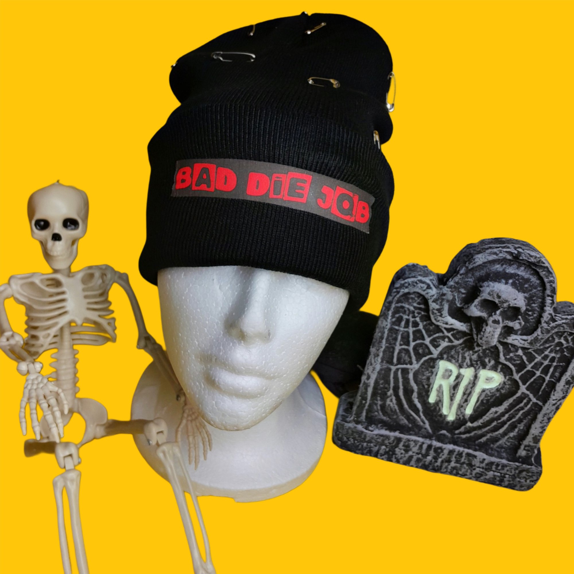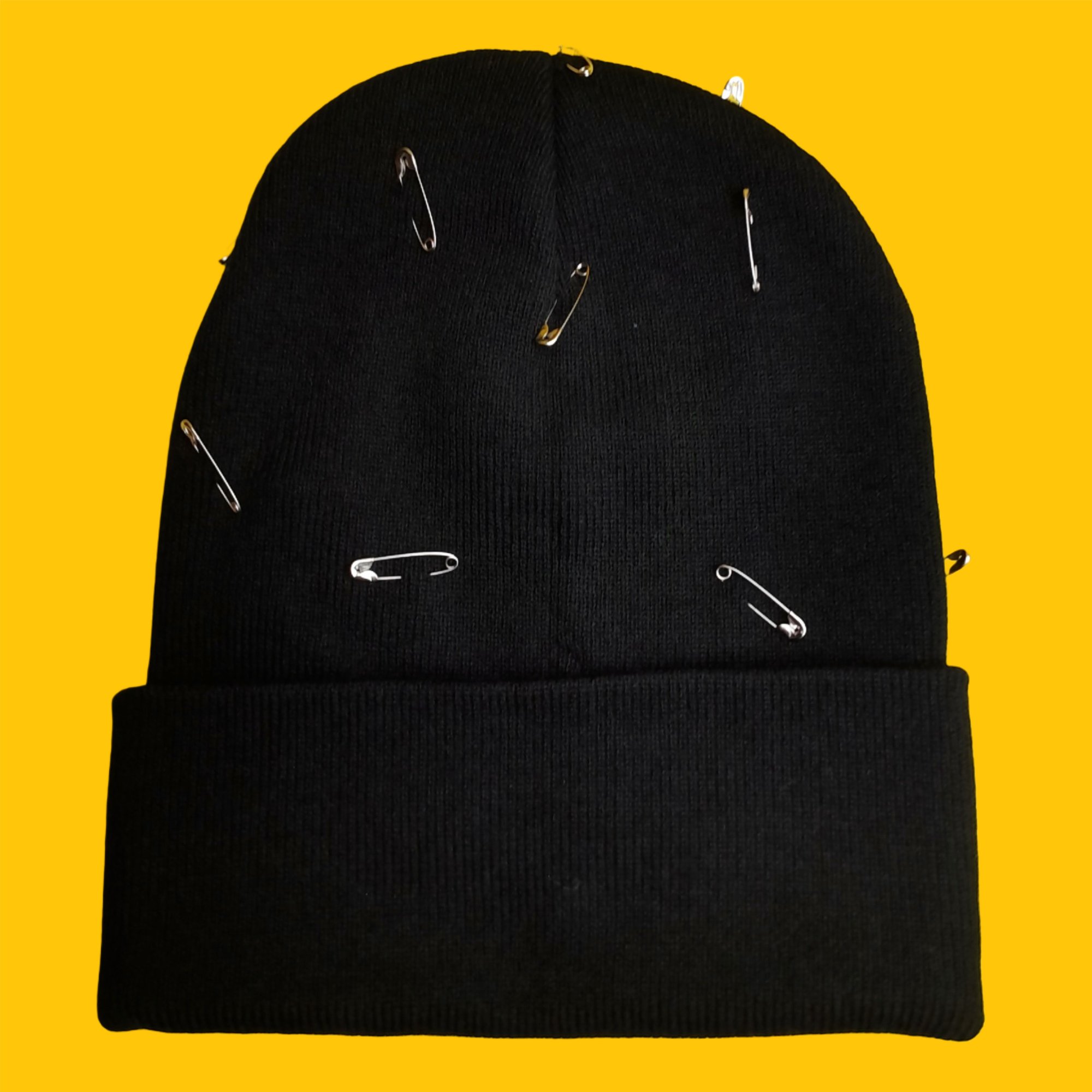 *Black beanie includes safety pins on the front and back with red font on the front.