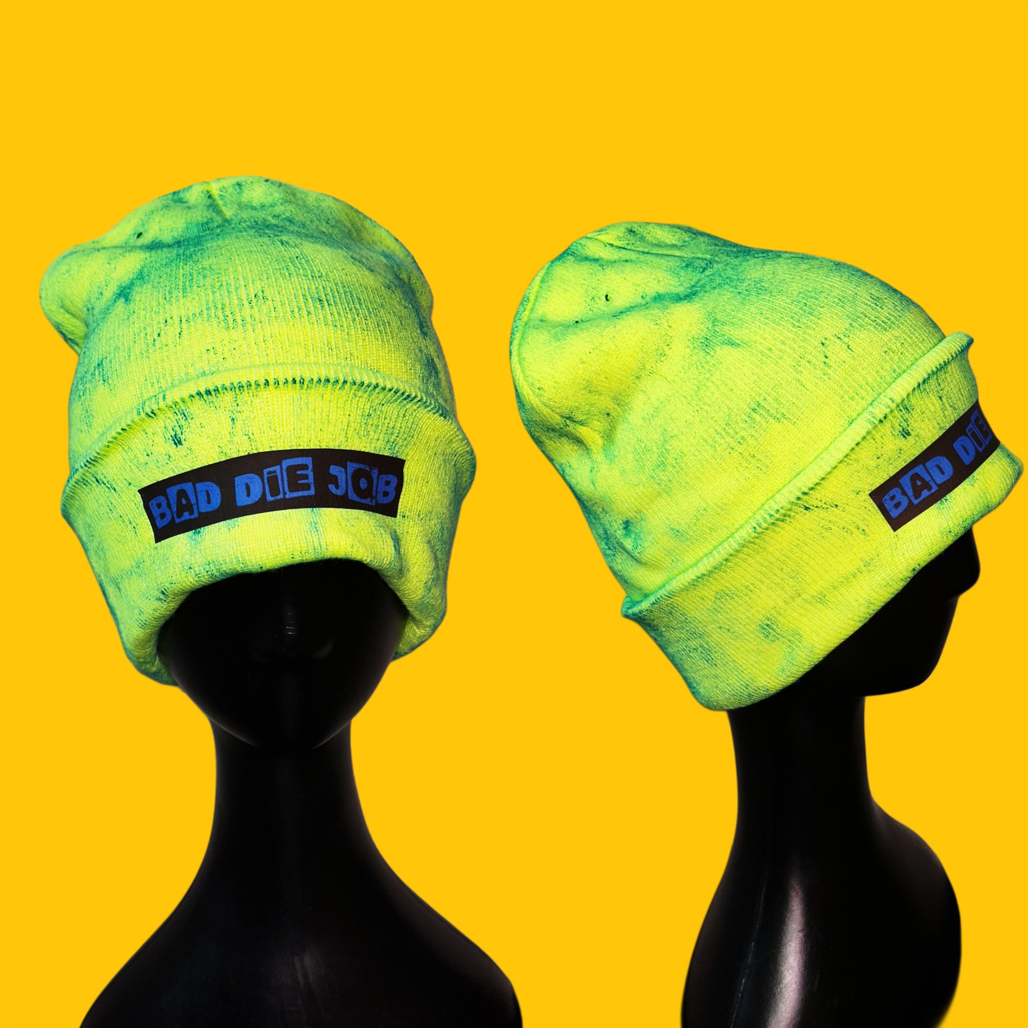 *Yellow beanie includes splotchy blue splatters on the front and back to resemble hair dye with blue font on the front.