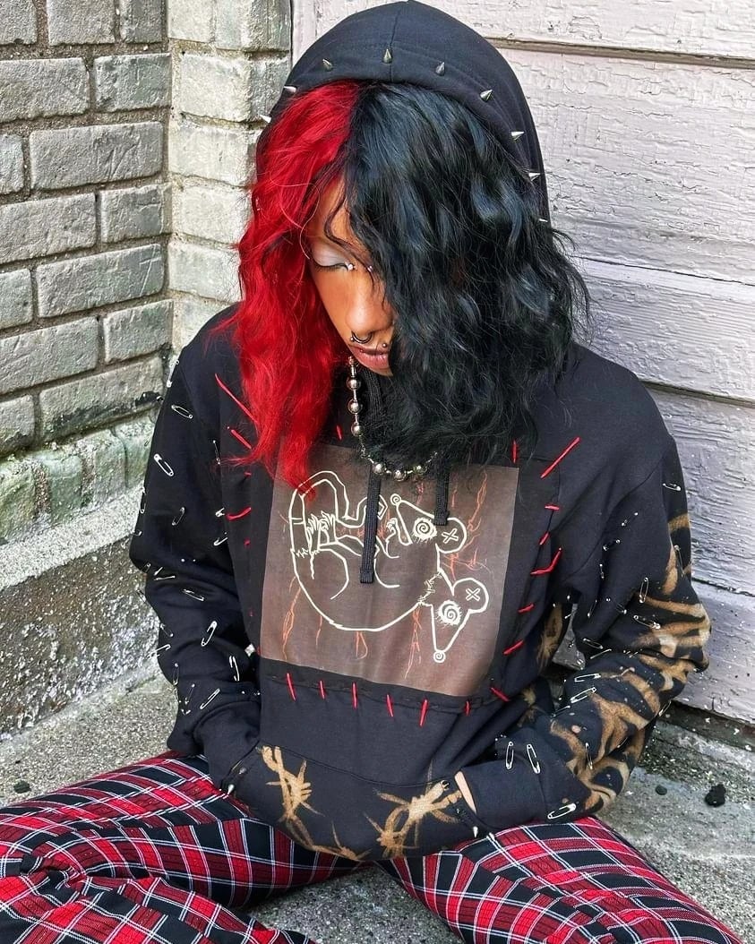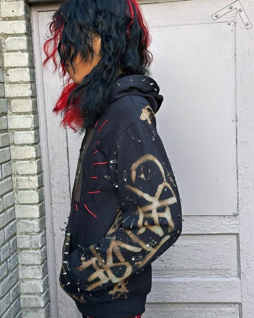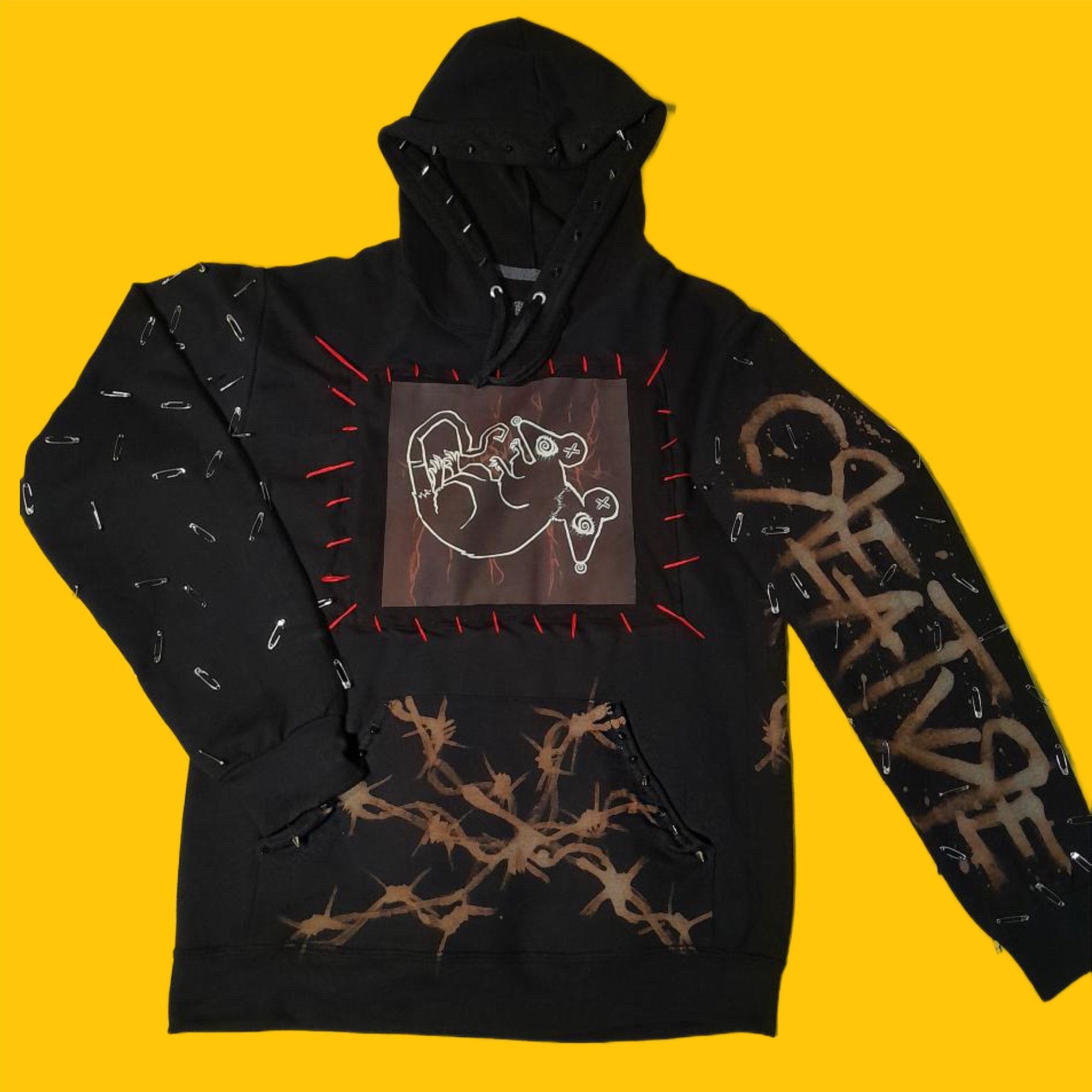 This item includes spikes along the hood and pockets, hand painted bleach work, individually applied safety pins, a hand stitched patch, and our CB logo on the back