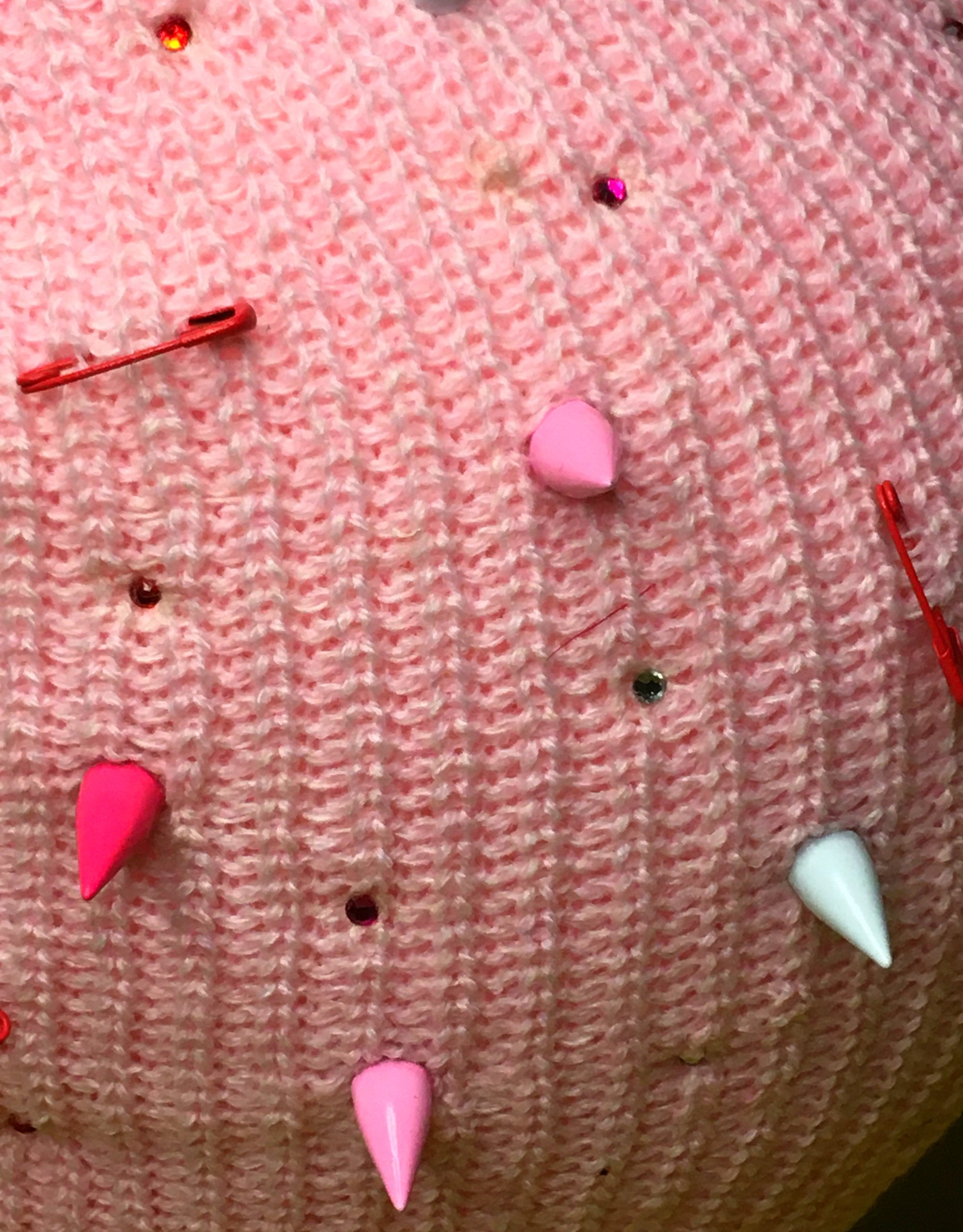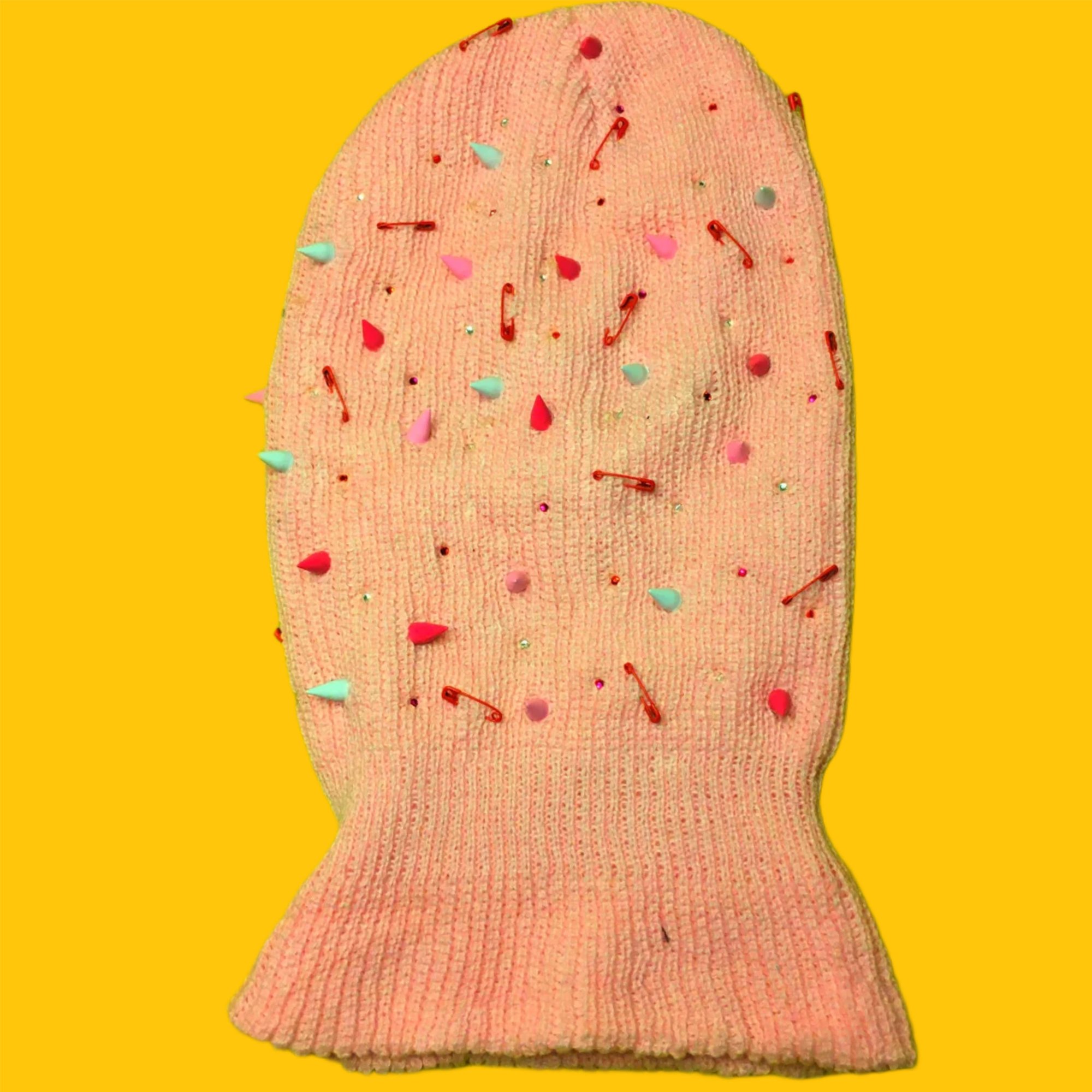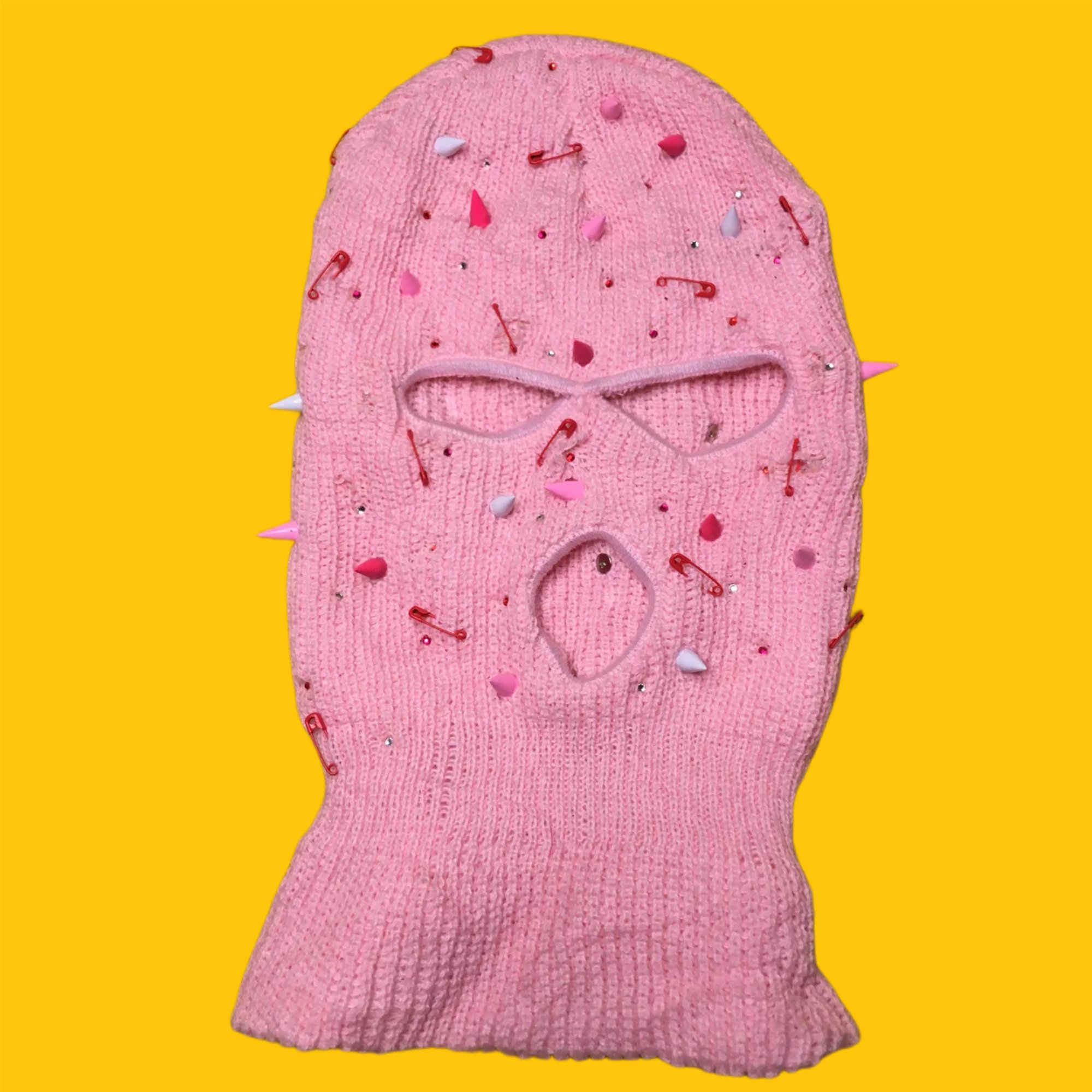 This is a 1/1 item that will not be remade or resold once it's gone. This item features individually applied red, pink, and silver rhinestones, individually applied pink, white, and hot pink spikes, as well as red safety pins all over. this took waaaaay too long to make and i have the burn marks to prove it lol